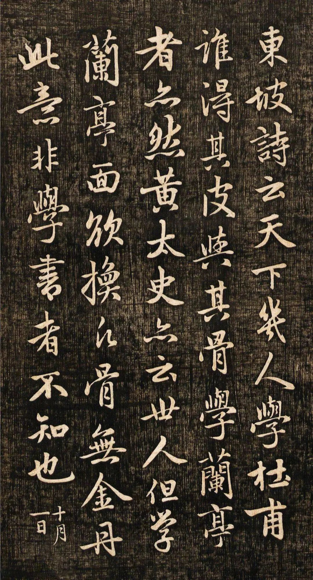 东坡诗云:“天下几人学杜甫,谁得其皮与其骨。”学兰亭者亦然。黄太史亦云:“世人但学兰亭面,欲换凡骨无金丹。”此意非学书者不知也。十月一日。