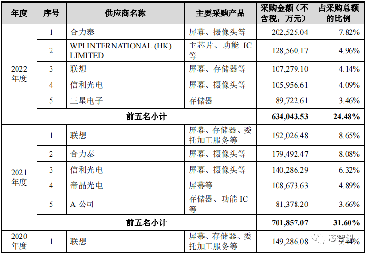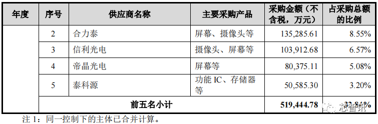 从龙旗科技前五大客户来看,小米及其关联方一直是龙旗科技的第一大客户,报告期的内占比分别高达41.96%、57.66%和45.52%。联想及其关联方、客户A也一直位列龙旗科技前五大客户,报告期内的占比分别为16.68%、13.97%、7.12%和13.48%、9.73%和7.38%。