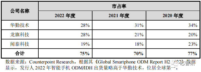 与此同时,ODM 行业的市场集中度也较高。根据 Counterpoint 数据,2021年全球智能手机 ODM/IDH 出货量近 4.83 亿台,占全球智能手机市场份额达39.4%,较去年增长 2.71%。其中,华勤技术、龙旗科技及闻泰科技为全球智能手机 ODM/IDH 市场的龙头厂商,三家公司的市场占有率在 2022 年达 75%,市场保持高度集中的格局。