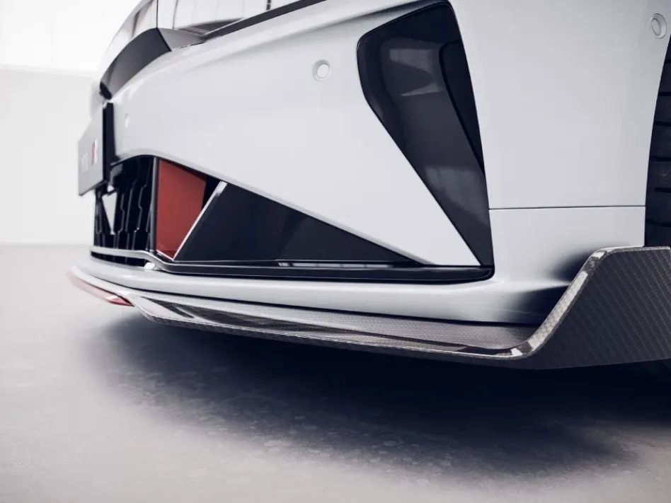 极氪001我们并不陌生,加上了个FR,新车的下包围设计一整个就是激进,宽大的格栅采用极氪很喜欢的橙色装饰件进行装饰,车头下部也新增了两个橙色进气口,一整个就是凸显高性能属性,车头两侧的导流槽也在一起凸出这个属性。