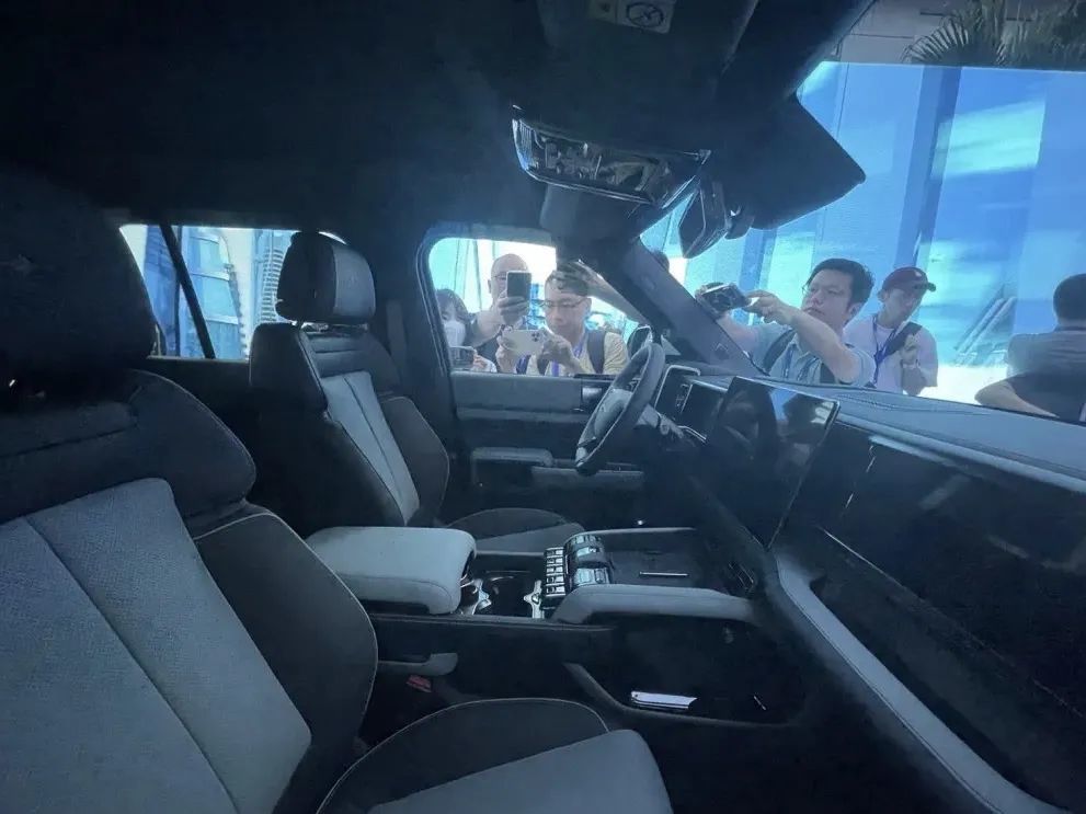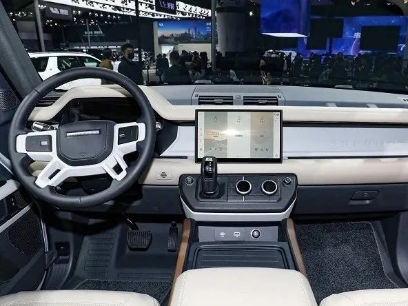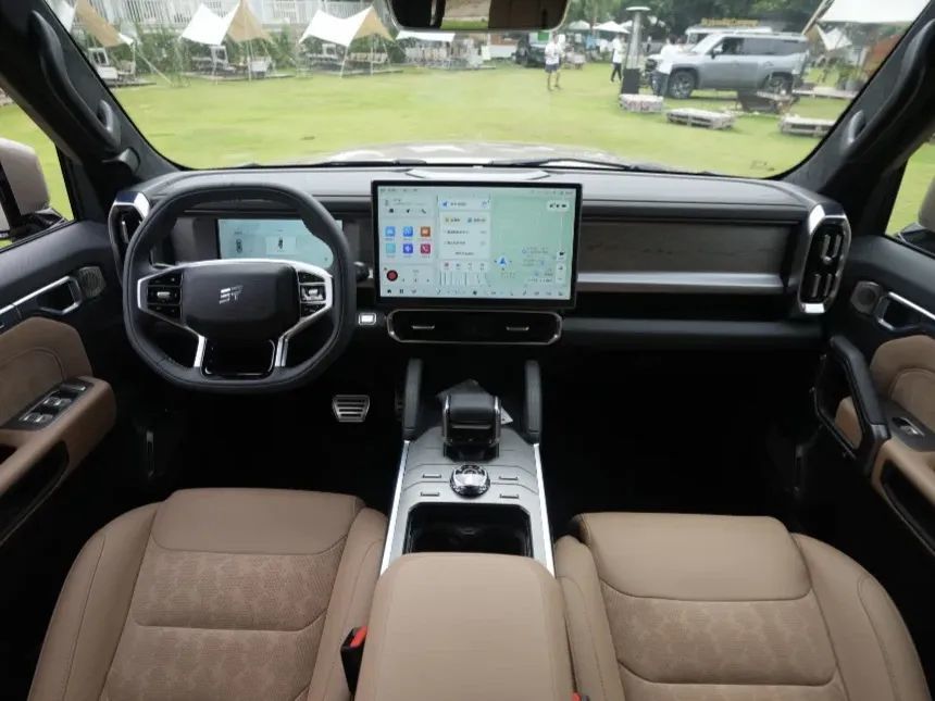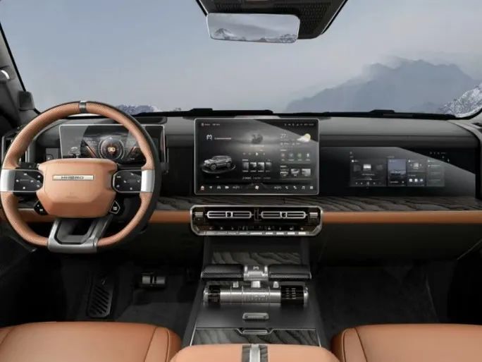 内饰可以看到三块大屏幕,一块仪表屏,一块中控屏以及一块副驾驶娱乐屏,作为一款有些机甲风的车型,猛士917在内饰细节方面做了一些小处理,例如中控屏幕镶嵌了保护边框,空调出风口也做了类似铠甲的纹路设计。