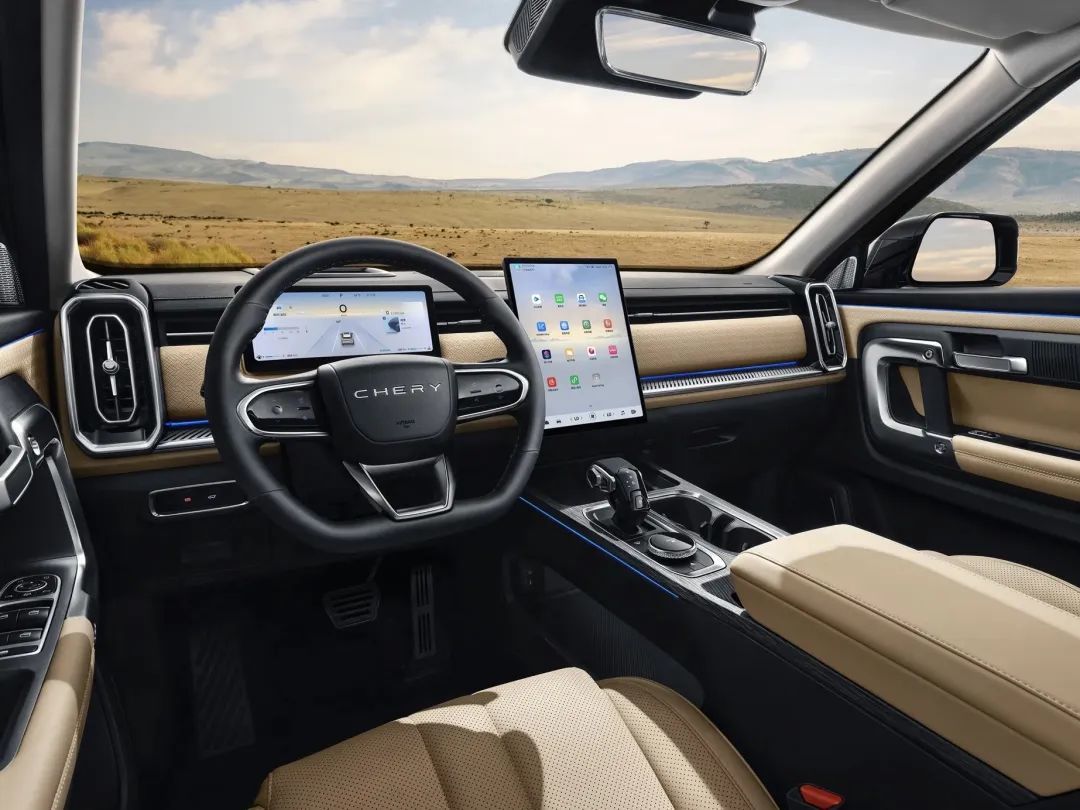 内饰方面,捷途旅行者注重豪华感与科技感的打造,方形方向盘配合造型别致的水晶挡把,车门扶手和挡把两侧都设计了把手,硬派感蹭蹭上升,10.25英寸仪表搭配15.6英寸中控大屏科技感十足,内置高通8155芯片,车机娱乐生态可玩性很高。
