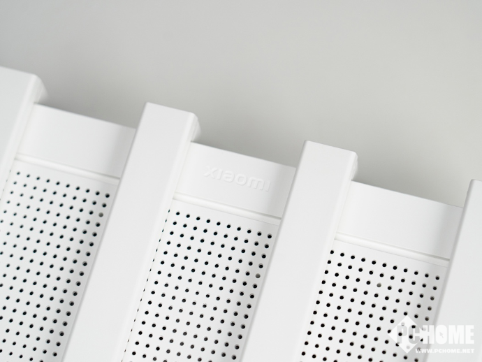 小米AX3000T进行了机身的A面进行了大面积的镂空打孔,配合底部的同样镂空来实现机身内部的散热。