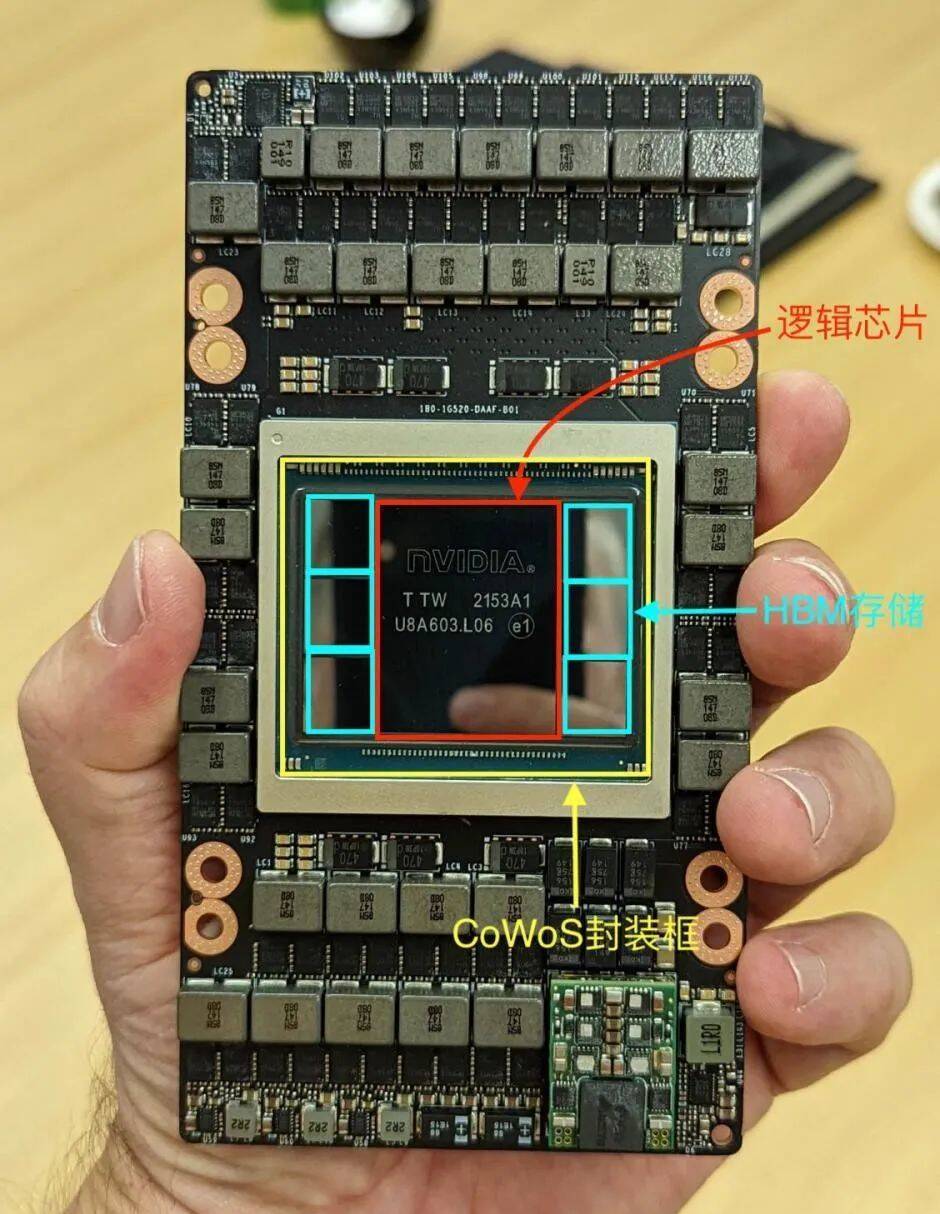 基于网上的一张H100的图(SXM5模组),简单标注如下:中间红色框就是核心逻辑芯片,周围围绕着6颗HBM存储芯片,然后7颗芯片整体用CoWoS工艺(一种Chiplet技术)封装起来。