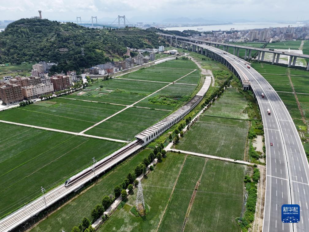8月26日,温州轨道交通S2线列车行驶在瑞安市路段(无人机照片)。