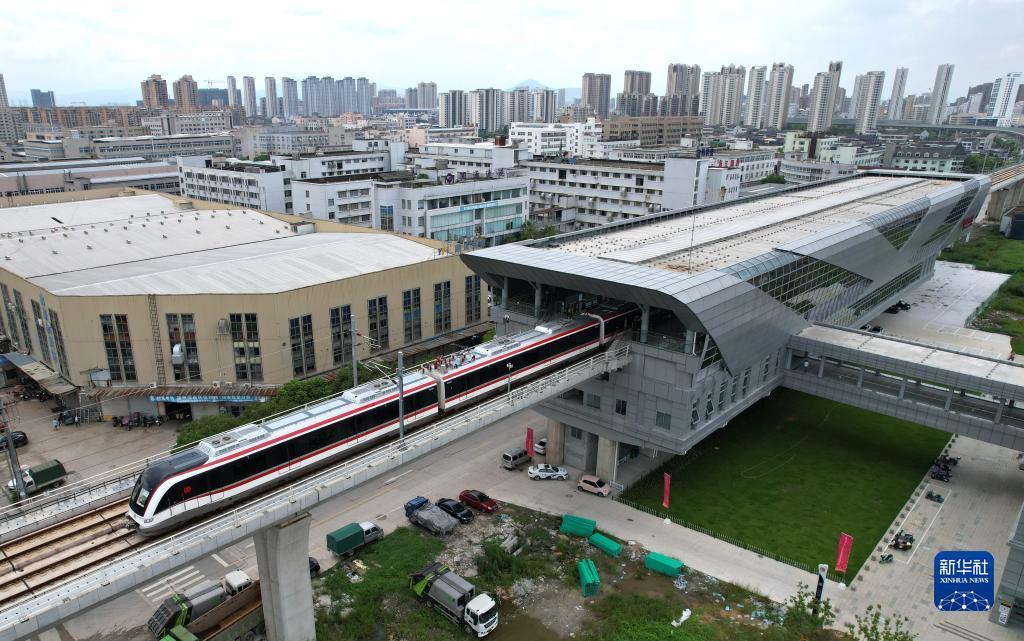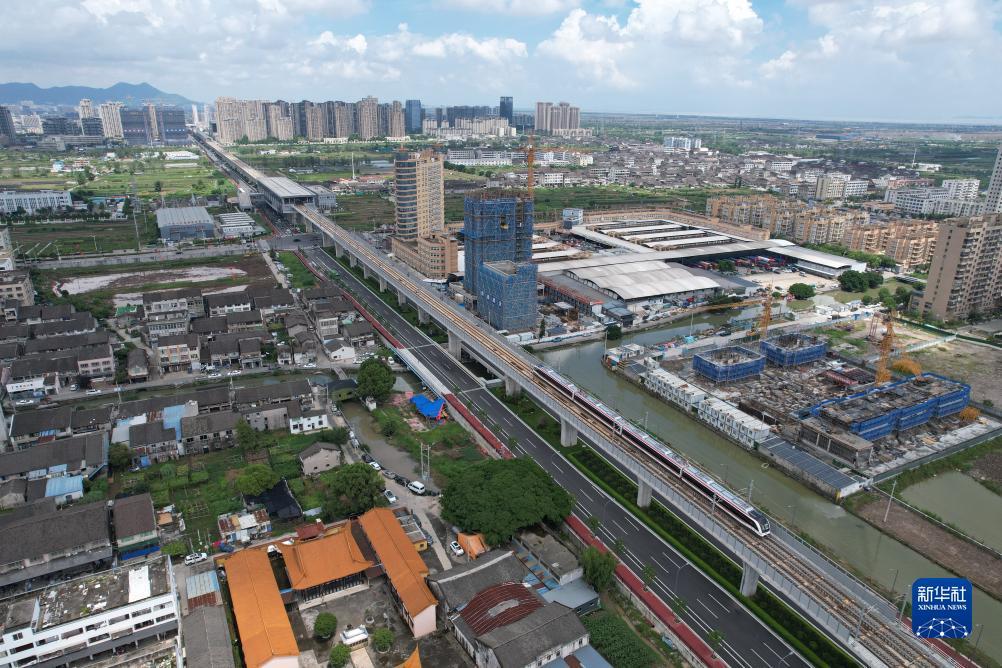 8月26日,温州轨道交通S2线列车驶出瑞安市上东路站(无人机照片)。
