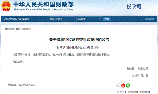 中国经济网北京8月27日讯 财政部网站今日发布《关于减半征收证券交易印花税的公告》(财政部 税务总局公告2023年第39号),为活跃资本市场、提振投资者信心,自2023年8月28日起,证券交易印花税实施减半征收。