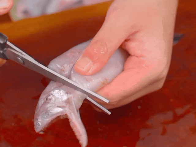 先把鱼处理一下,给鱼头剪上一刀,再拽着鱼头轻轻一拉内脏就出来了。
