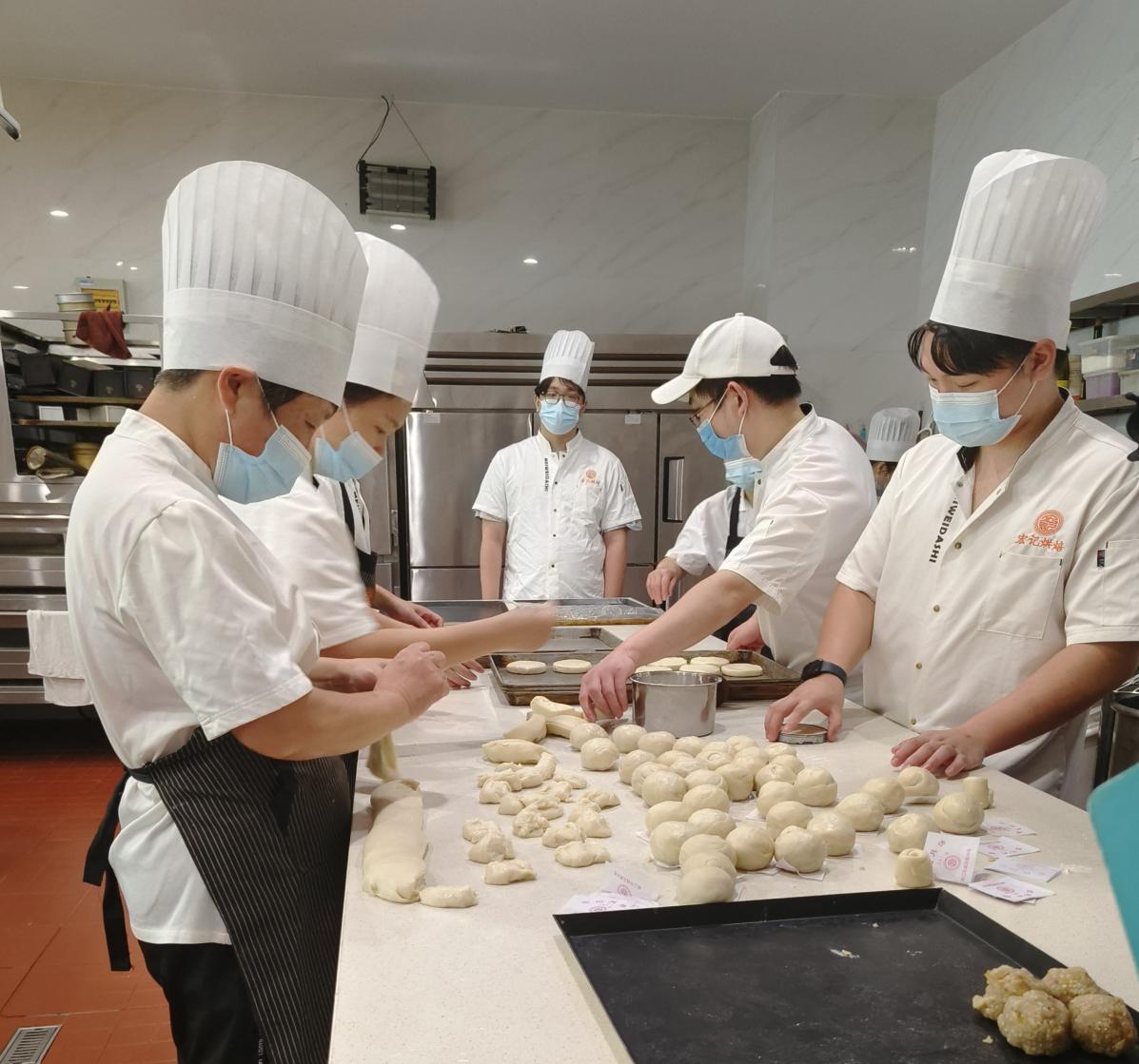 丁钽洋表示:“新手师傅一天200个封顶,我们的老师傅一天2000个分分钟完工。烤箱刚出来200度的高温,就直接上手翻面涂蛋液。”