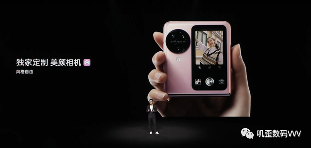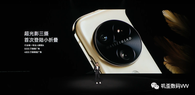 OPPO Find N3 Flip搭载了小折叠的首个超光影三摄,搭载了专业人像摄像头、广角和超广角摄像头三摄像头,全面继承了OPPO Find X6系列的旗舰计算摄影能力,超清画质引擎、自然色彩引擎和光影图像引擎,也有哈苏认证。刘作虎在发布会上表示,OPPO Find N3 Flip不仅是手机,也是人像出片神器。