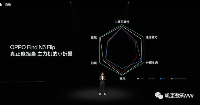 OPPO认为,竖向大外屏才是小折叠最正确的选择,因为直板手机用户超过93%时间是竖着用的。在发布会上还用OPPO Find N3 Flip的竖屏去吐槽了vivo以及三星的小折叠屏外屏设计。