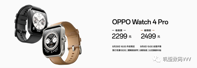 OPPO Watch 4 Pro采用了寰宇曲面设计,精钢表壳和陶瓷底盖,支持LTPO常亮屏多功能定制表盘,骁龙W5+BES 2700旗舰双芯,2GB运行内存,标配独立 eSIM。破晓棕售价2499元,极夜黑售价2299元,预订可享100元优惠。