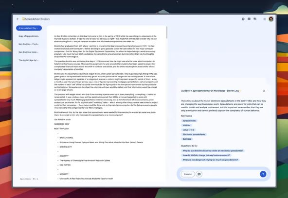 NotebookLM可以为文档生成摘要和大纲,帮助用户更好地浏览文档内容。它还会推荐可能的问题,引导用户进行有针对性的文档探索。