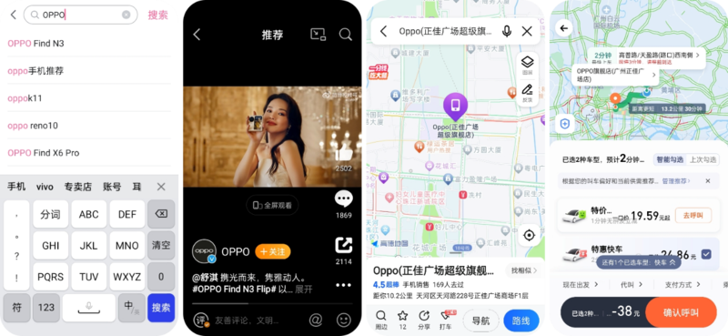 除了以上这些专门适配的App,通过“外屏自适应引擎” Find N3 Flip还能在外屏上使用很多第三方热门应用,比如微信、支付宝、QQ、百度地图、哔哩哔哩、滴滴出行、抖音、航旅纵横等,并且支持完整的功能。,很多场景下不打开内屏就能直接处理日常事务,比如打车的时候不用打开内屏就能查看司机到哪儿了,让你的一切轻交互都能在这块外屏中完成。