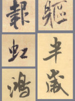 类楷书结字的规律,为了忌讳字的平齐,字的各部分适度错开位置,反而重心安稳,生动有趣,从中也体验到书法家创造性的表现。如“报”、“躯”、“虹”、“鸿”是上下错位,“半岁”是左右错位。