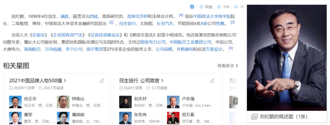 百度百科显示,刘纪鹏是中国政法大学资本金融研究院院长,是全国人大《证券法》《企业国有资产法》《证券投资基金法》和《期货交易法》起草小组成员。他还是著名的股份制和公司问题专家,擅长大公司股份制、集团化和国际化理论与实践的结合,主持过国家电力公司、中国航空工业集团公司、中铝公司、大唐电力、海南航空、万向钱潮、李宁公司、海尔集团等270多家企业的股改上市、公司战略、并购重组和投资方案设计。