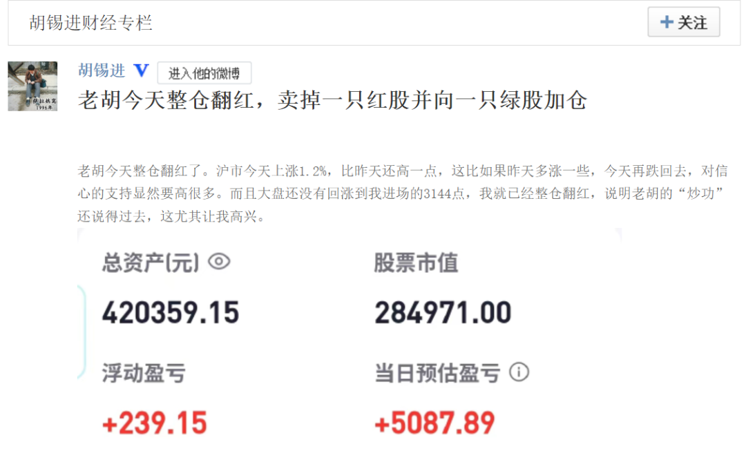 胡锡进财经专栏发文显示,老胡在6月27日正式入市,期间市场起起伏伏来回震荡,他赚没赚到钱不太清楚,赚到的流量绝对是大大的。