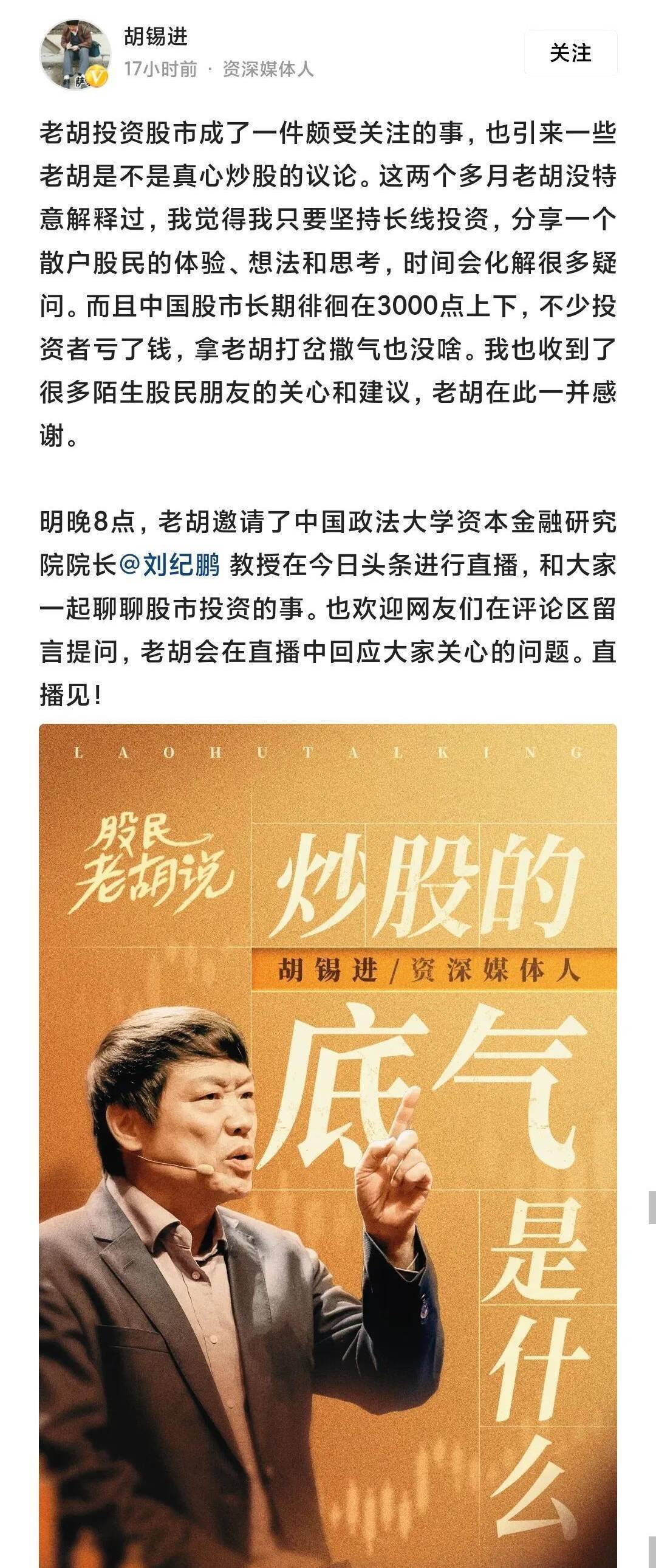 在入市炒股整整2个月之后,“股市小白”胡锡进居然要开直播聊股市了!