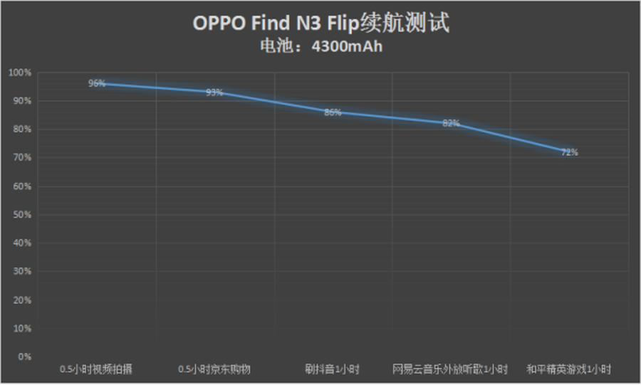 通过运行了4小时的续航测试,其中包括0.5小时视频拍摄(使用后置摄像头)、0.5小时京东购物、刷抖音1小时、网易云音乐外放听歌1小时(音量50%/手机折叠)、和平精英游戏1小时。最终,在4小时的续航测试后,OPPO Find N3 Flip的剩余电量还剩下72%。可以说,在竖屏折叠手机领域,OPPO Find N3 Flip的续航实力堪称佼佼者。