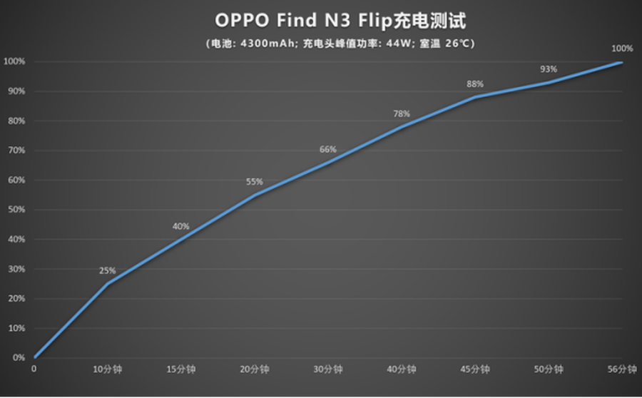 除了拥有出色的续航表现,OPPO Find N3 Flip的充电速度也是可圈可点。其虽然标配了一个67W的充电头,但这款手机支持44W超级闪充功能。经过实测,Find N3 Flip在10分钟时间可以将电量充至25%,最终56分钟可将手机电池充至满电。一般利用午休时间,这款折叠屏手机基本上就能“满血复活”。