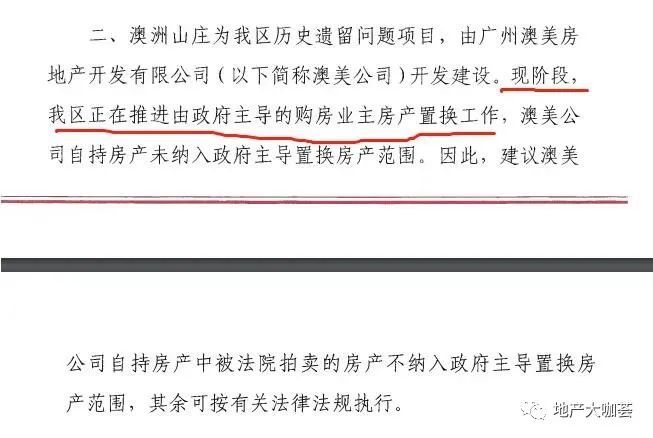 在一份由广州市规划和自然资源局出具的,关于(2022) 粵0104执恢421号《司法拍卖咨询函》的复函中明确写道,澳洲山庄为历史遗留问题,由澳美公司开发建设,”现阶段,正在推进由政府主导的购房业主房产置换工作,澳美公司自持房产未纳入政府主导置换房产范围。“因此,建议澳美公司自持房产中被法院拍卖的房产不纳入政府主导置换房产范围,其余可按有关法律法规执行。