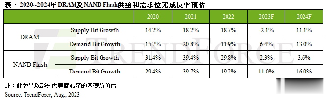 据市场调查及研究机构TrendForce最新的预测显示,预计2024年存储芯片原厂对于 DRAM 与 NAND Flash 的减产策略仍将延续。尤其,以亏损严重的 NAND Flash 更为明确。预估在 2024 年上半年消费性电子市场需求能见度仍不明朗,加上通用型服务器的资本支出仍受到 AI 服务器排挤而显得相对需求疲弱下,鉴于 2023 年基期已低,加上部分存储产品价格已来到相对低点,预估 DRAM 及 NAND Flash 需求位元年成长率分别有 13% 及 16%。