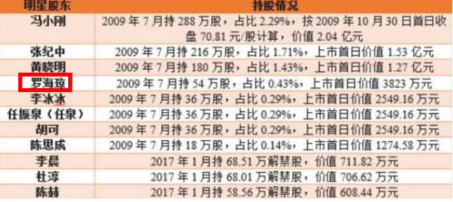 2009年年底,华谊公司上市的时候,罗海琼以54万股高居明星股东排行榜第四位,可谓是手握半个娱乐圈的女人。