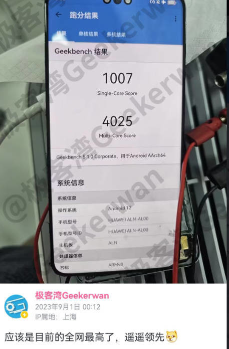 从相关图片我们可以看到,图中的这款华为Mate60 Pro在Geekbench平台上的跑分为单核心10007分、多核心4025分,这个成绩已经追上了目前主流的旗舰级移动平台了。作为对比,在Geekbench平台上,骁龙8+Gen 1的跑分为单核心1330分、多核心4350分左右;骁龙8+Gen 1(降频版)跑分为单核心1260分、多核心4000分左右;联发科天玑9000+处理器的跑分为单核心1350分、多核心4350分左右;苹果A13仿生芯片的跑分为单核心1330分、多核心3625分左右。考虑到华为仍然受到不小的限制,麒麟9000S能有如此好的性能表现非常不易。