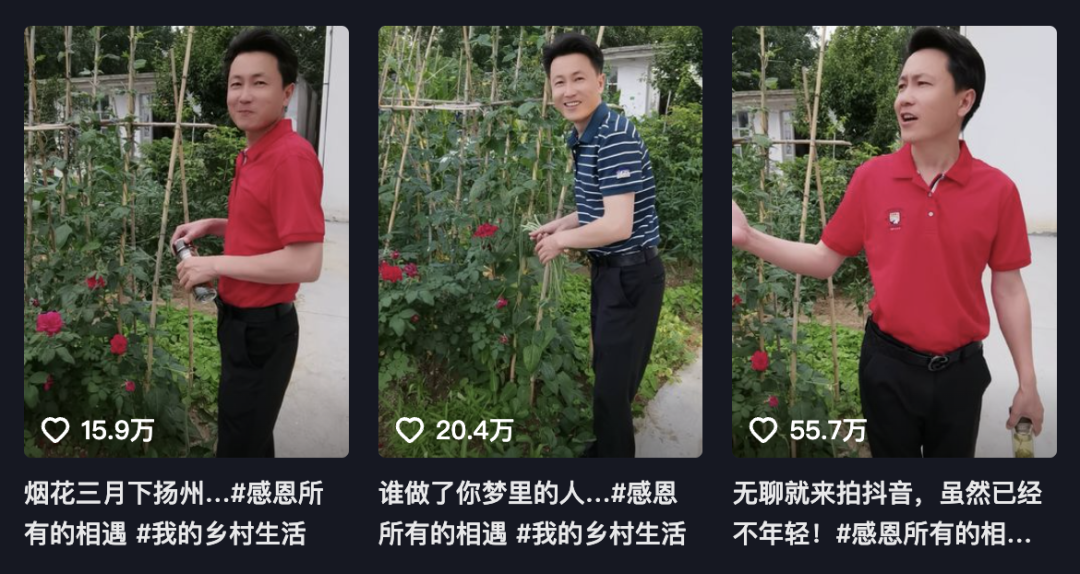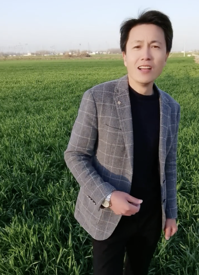 秀才平时会在抖音发布一些视频,基本都是他以各类乡村风光为背景,去对口型唱歌。挑选的歌曲,也大多是《 花儿都开了你来不来 》、《 桃花运 》这类大姨们最爱的 “ 经典情歌 ” 。