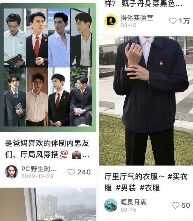 其实在秀才打入年轻人内部之前,年轻群体曾经追捧过一段时间的厅局风穿搭。衬衫配西裤,精致且干净,手拿保温杯,假装体制内。这种穿着正气、端庄、大气、沉稳,给人一种可靠感和安全感。