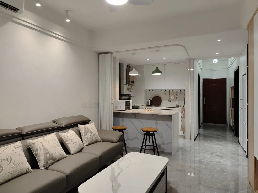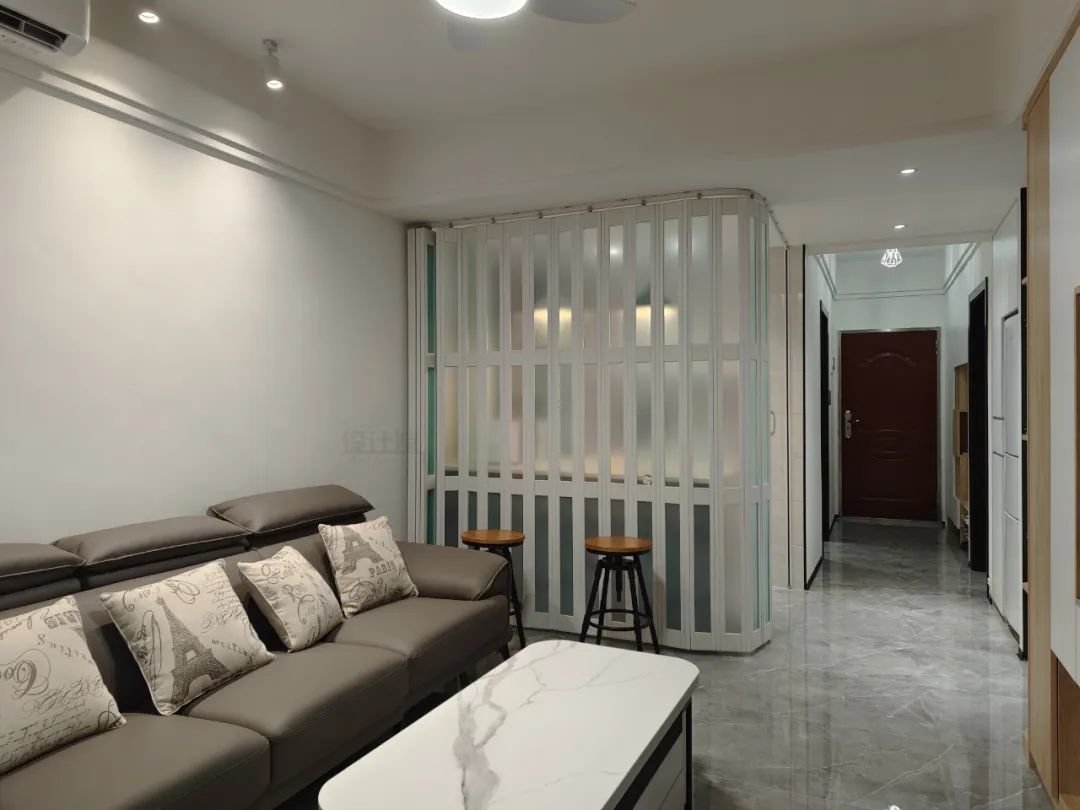 若经常做饭担心油烟问题,或是燃气公司不让做开放式厨房的,其实可以采取隐形折叠门来做厨房门,平时收起来保持空间宽敞,必要时也能暂时隔离厨房空间。