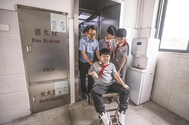 今年暑假,朱行中学专门为小徐量身打造了一台新电梯。“有了电梯,以后就可以让同学们推着你去各个楼层的专用教室,和大家一起活动了。”张华根一边介绍,一边推起轮椅,带着小徐开启了一次特别的校园导览。