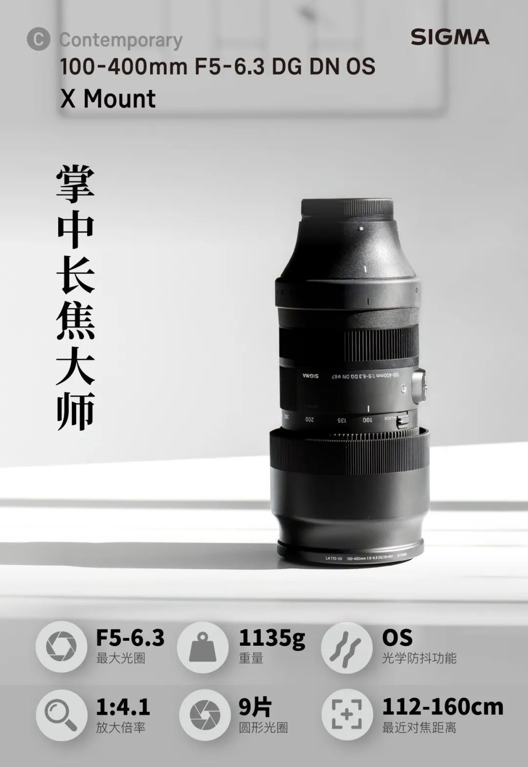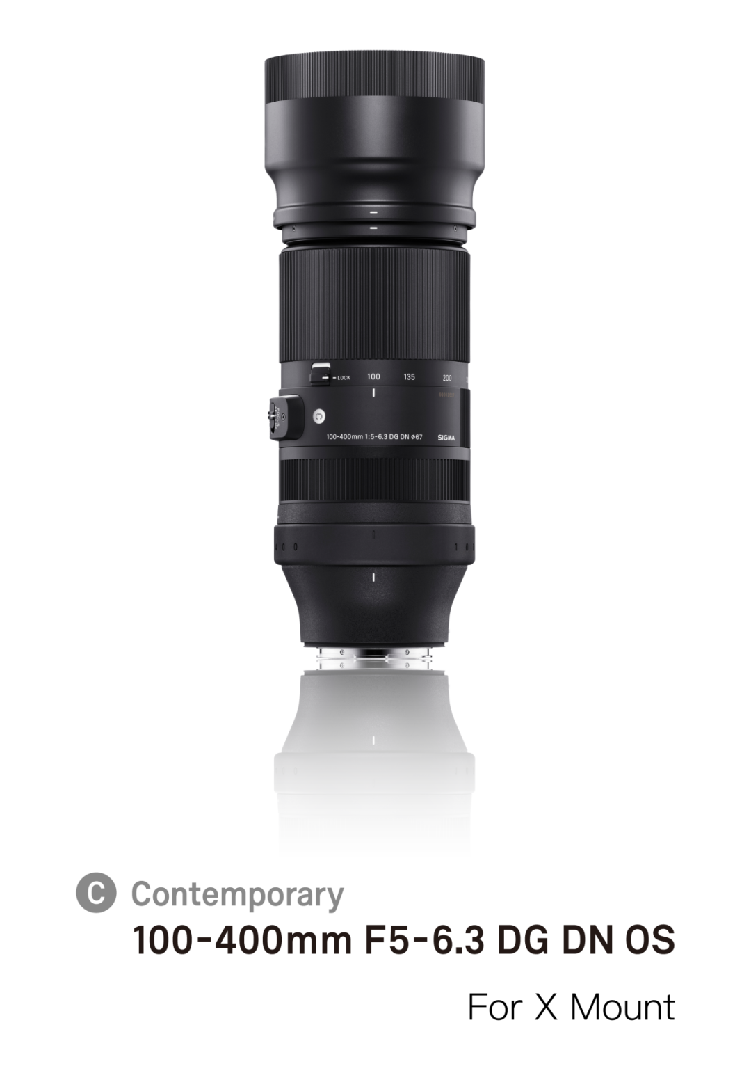 SIGMA 100-400mm F5-6.3 DG DN OS | Contemporary是适马第一支加入FUJIFILM X 卡口阵容的全画幅超长焦变焦镜头。除了覆盖广角至中长焦的APS-C画幅DC DN 镜头(16mm,23mm,30mm,56mm F1.4和18-50mm F2.8),适马为X 卡口进一步扩大长焦镜头阵容,推出了紧凑型的全画幅相机规格的超长焦DG DN变焦镜头,X卡口阵容总数量达到6支。