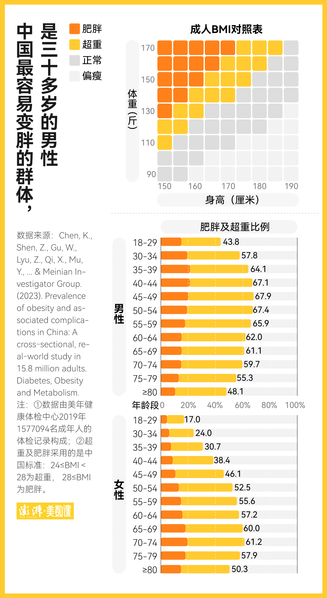 根据中国人的体质,成年人的 BMI 指数(体重(千克)/【身高(米)的平方】)分别达到 24 和 28 时,就是超重和肥胖。基于这一标准,近期发表于学术期刊《糖尿病、肥胖与代谢》上的一篇名为《中国肥胖患病率及相关并发症:1580 万成年人的横断面真实世界研究》论文,就统计出了中国的整体发胖情况:有 34.8% 的人超重,另外还有 14.1% 的人有更严重的肥胖问题。