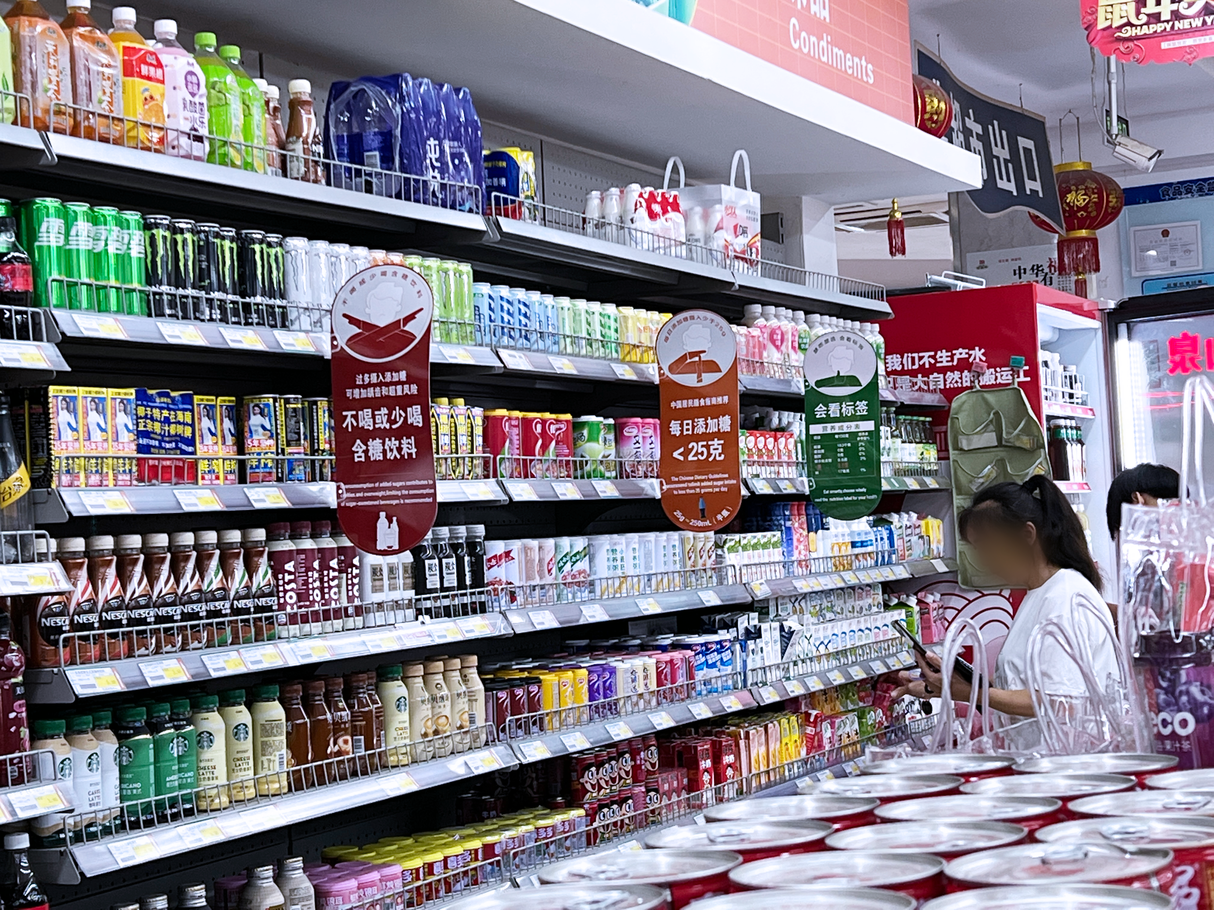 上海市嘉定区一超市内悬挂了含糖饮料警示标识。