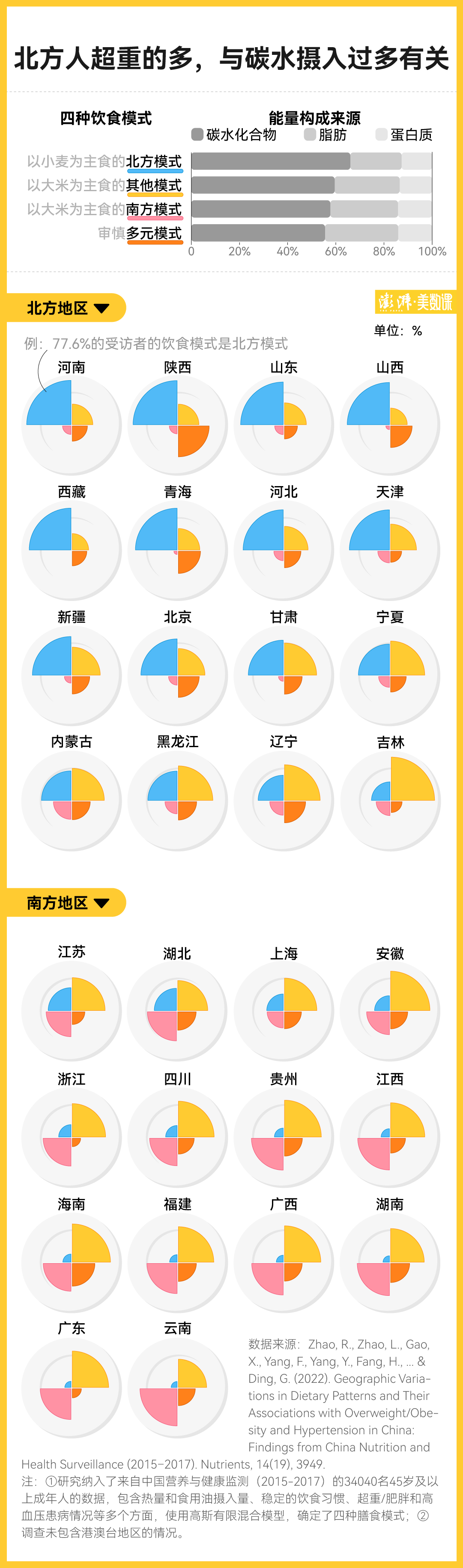 其中,北方膳食模式相对其他模式,有更多的能量是来自碳水化合物(超过 60%),研究认为这可能就导致了北方地区的超重和肥胖风险更高。