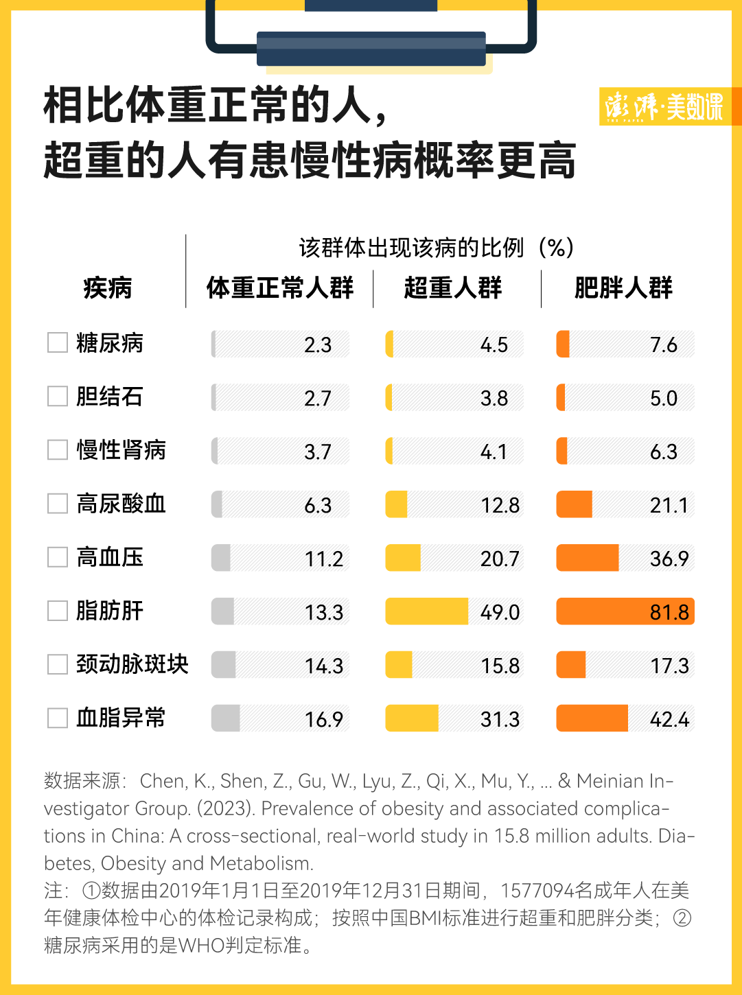 这一判断不仅是基于国内的肥胖群体日益扩大,也和肥胖作为独立的慢性疾病及其他众多慢性疾病的重要致病因素之一有关。大量医学研究表明,肥胖是高血压、糖尿病等疾病的重要诱因。与 BMI 正常者相比,超重/肥胖者的并发症患病率更高,且 BMI 越高,并发症越多。因此,发胖这件事,增长的不只是肉,还有慢性病。