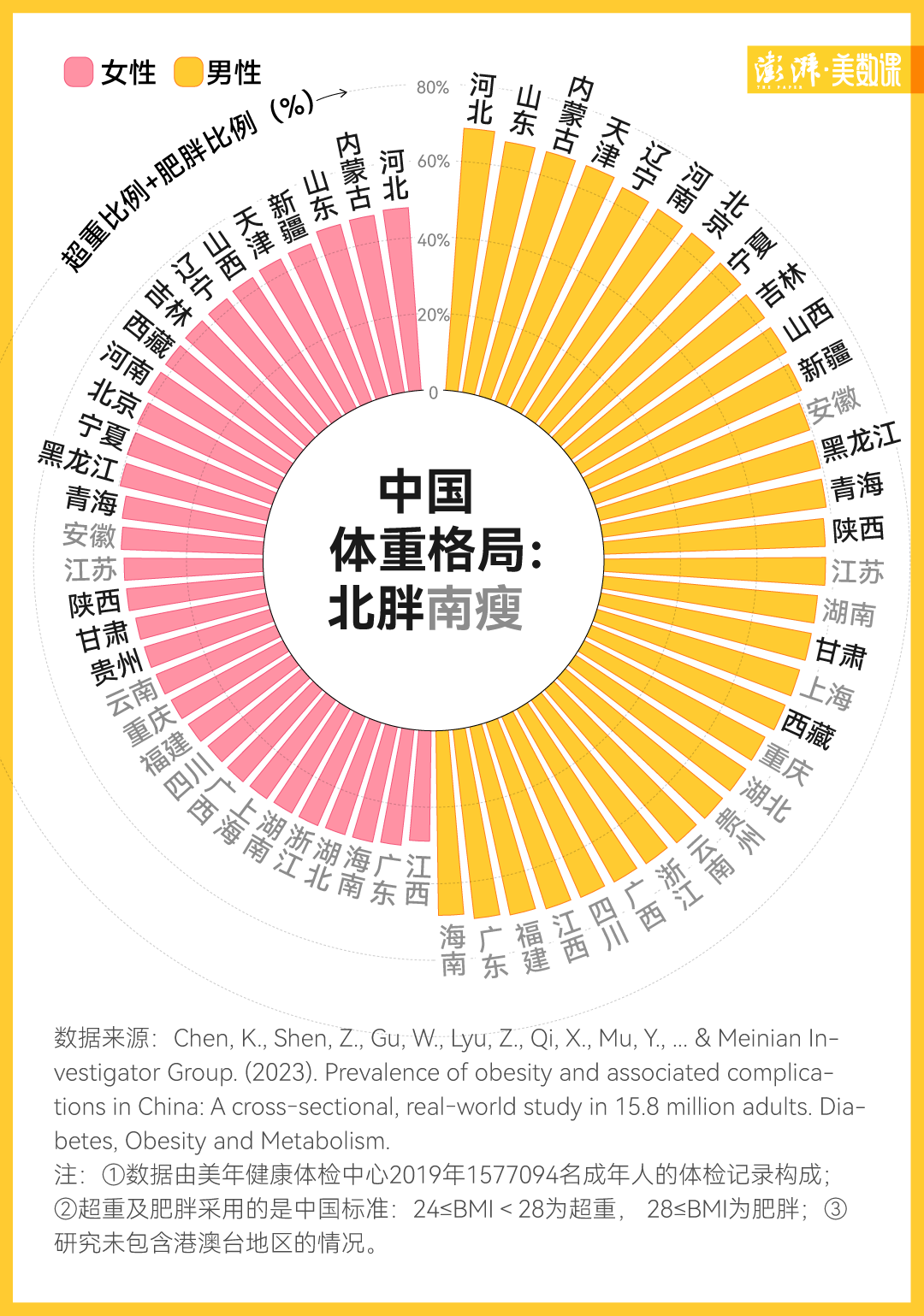 除性别、年龄上的差异外,肥胖率在地域分布上也有所不同。在很多人印象中,北方人比南方人都要大上一号。而《中国肥胖患病率及相关并发症》这份研究也印证了这一印象——中国北方地区的超重率和肥胖率都高于南方地区,其中,内蒙古、山东和河北的两项数据都是位列全国前三,而广东、海南和江西则是全国瘦子最多的 3 个省。