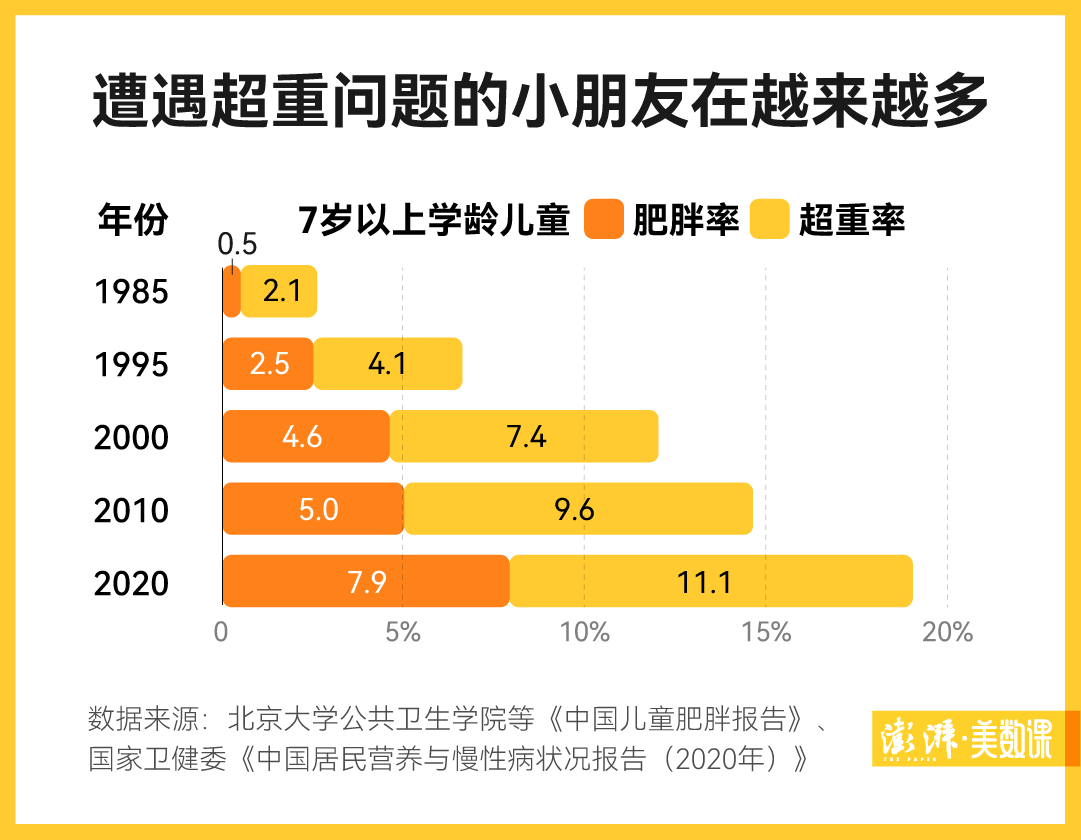 因此除了成年人,儿童的肥胖情况也同样不容忽视。根据国家卫健委在 2020 年发布最新一期《中国居民营养与慢性病状况报告》,与 1985 年时,中国 7 岁以上学龄儿童超重和肥胖率仅 2.6% 比,现在的小朋友遭遇体重问题的比例也已经上升到了 19.0%。
