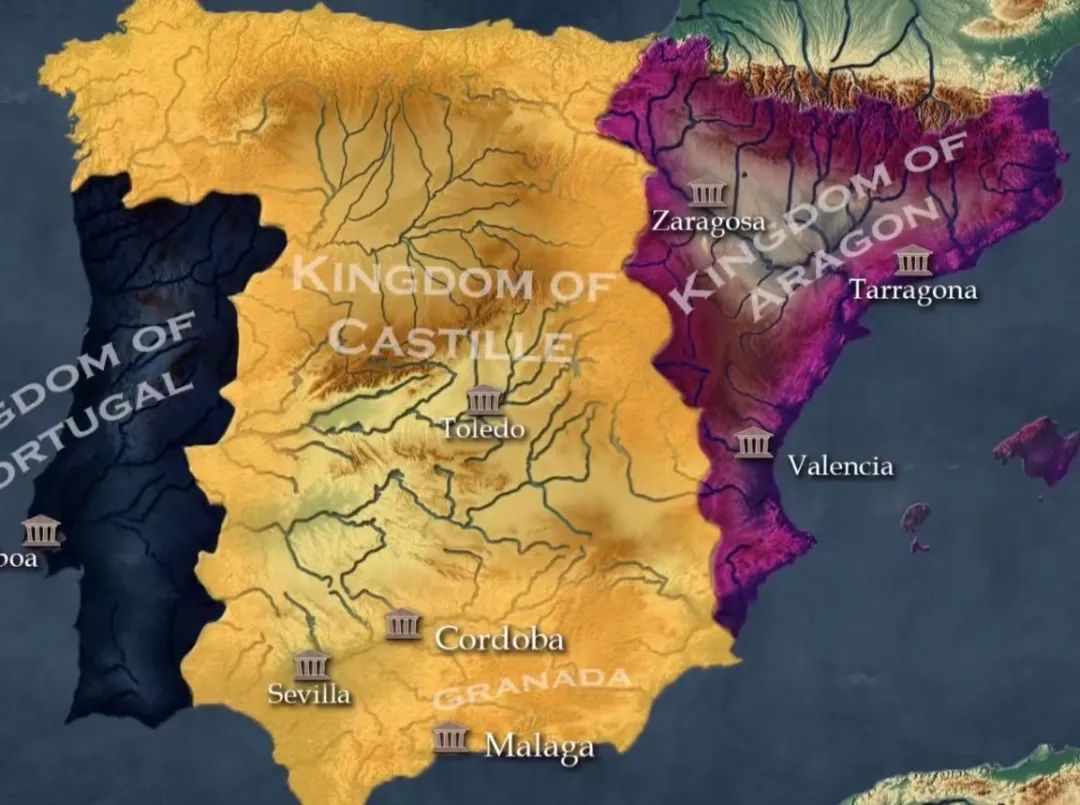 ▲中间的卡斯蒂利亚和右边的阿拉贡,联合成西班牙王国