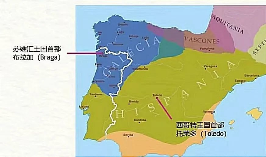 在半岛上,日耳曼人的两个别支西哥特人和苏维汇人,他们的势力范围也分别是,今天西班牙和葡萄牙两国的雏形。