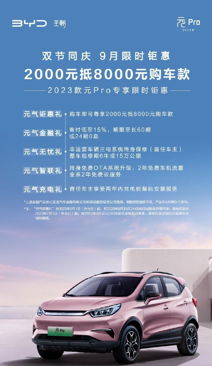 鞭牛士 9月2日消息,比亚迪推出2023款元Pro限时购车优惠政策,包括: