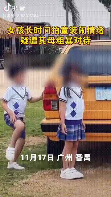 视频中的女儿大概10岁左右,也许是拍照累了,她有点驼背。但站在一旁的妈妈却突然朝着女孩的肩膀狠狠地拍了一棍子。