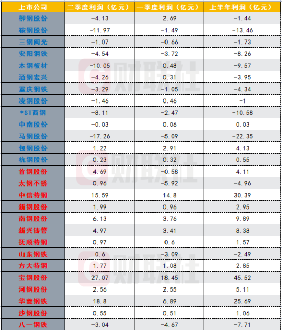 从上市公司披露的半年报来看,27家钢铁冶炼企业中除安阳钢铁(600569.SH)及柳钢股份(601003.SH)同比减亏外,其他钢企业绩较去年同期相比均呈不同程度下滑,其中13家钢企亏损,合计亏损总额超90亿元。
