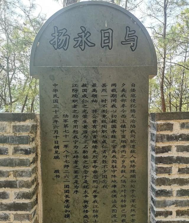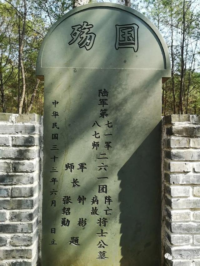 譬如几乎看不出什么痕迹的大山头炮兵阵地。再譬如,太平镇人民政府边上的一处军医室,是一处民房端头的一间,“军医室”三字仍在。还有一处,给我很大震撼,在太平镇戈家山,我们的车从山间土路开进去,看到几只五彩的野鸡在山坡上跑过。下车,穿过松林,来到半山腰,一旧一新两块墓碑映入眼帘。左侧旧碑已经残破,勉强用水泥镶嵌着竖立,右侧新碑是复制旧碑的,正面抬头是“国殇”两个大字,底下竖排写着“陆军第七十一军八十七师二六一团阵亡/病故将士公墓 军/师长钟彬 张绍勋 题 中华民国三十三年六月 日立”,碑的背面,抬头是四个大字“与日永扬”,底下是竖排小字: