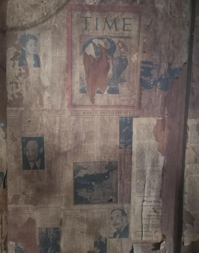 在进入王家大院这天,我还去了罗家大院。朋友说,这儿要拆了,房子都快垮了,别进去了吧?我仍旧坚持要进去看看。罗家大院门口没立碑石,应该不是任何级别的文保单位。眼前是无数染饭花,风一吹,高低起伏,香气扑鼻,完全不知所谓的院子在哪儿。我们在密林里硬生生开出一条小路来,兜兜转转,走进去后,只见瓦断垣颓,碎砖乱石遍地。一不小心,脚扭了一下,瞬间疼痛钻心,还以为骨折了,蹲下查看,所幸并无大碍。屋子欹斜了,从堂屋边的一道楼梯上去,站在嘎吱嘎吱响的楼板上,猛然发现,落日余晖里,房间隔断上都贴着英文报纸,TIME的报头比比皆是,文字大多看不清了,但人物仍清晰可辨,那些曾出现在历史书上的人物,丘吉尔、罗斯福、斯大林、蒋介石等等,在不同的位置出现。除了报纸,还有不少海报,上面的人物都是打扮香艳的西洋美女。查资料得知,国际医疗队的医生曾驻扎在这儿。