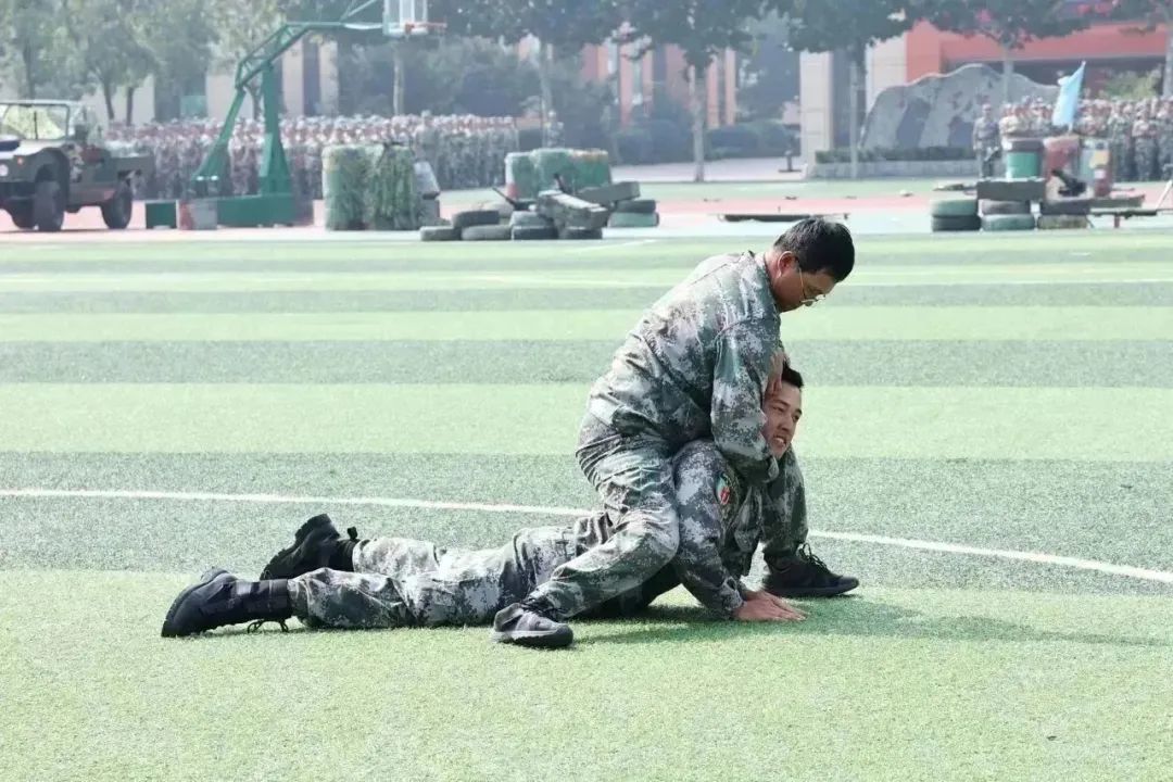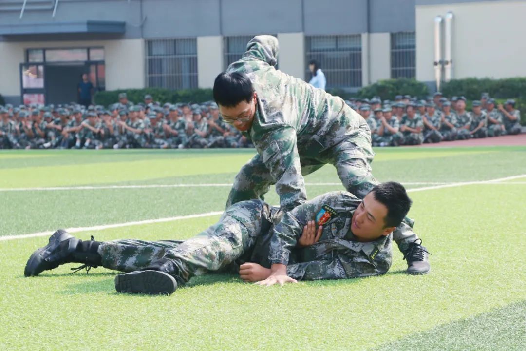骄阳似火,百炼成钢。军训教官们进行了示范表演,令人热血沸腾。他们眼神坚毅自信、口号高亢嘹亮、动作干净利落,以过硬的军事素质赢得阵阵掌声。