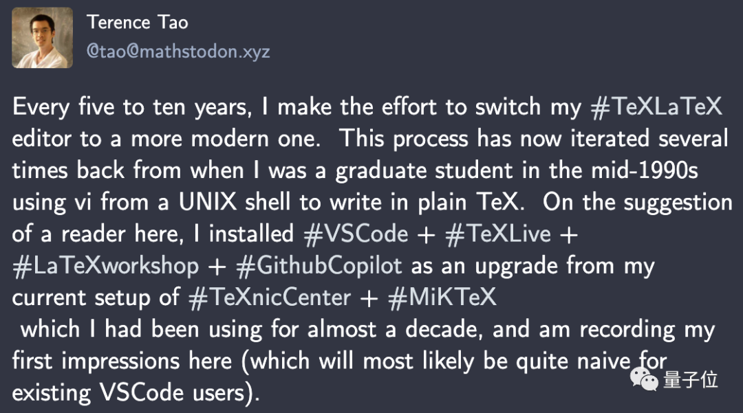 陶哲轩本人在Mastodon上透露了这一消息,顺便介绍了一波自己用的LaTex工具。