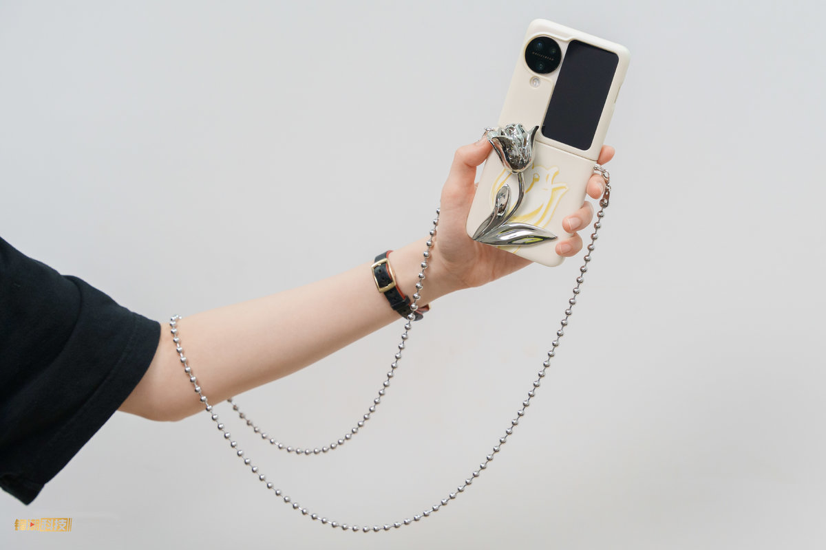比如来自设计师 MING MA 创意的拂风郁金这款手机壳,就在折叠屏的下半部分配上了一朵金属雕塑一般的郁金香花朵,配合金属串珠的挂绳,看起来格外有格调。