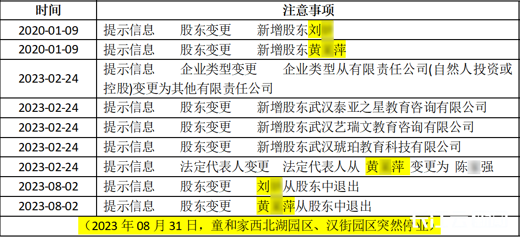 表2:武汉童和家教育咨询有限公司经营变动事项